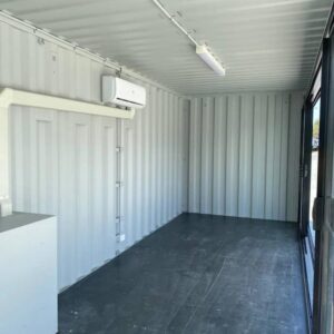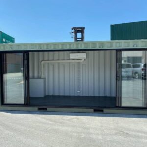 O novo contentor de escritório de 20 pés é uma solução modular moderna e funcional, concebida para proporcionar um ambiente de trabalho luminoso, climatizado e pronto para utilização imediata. O amplo painel lateral de vidro de 4,5 metros oferece uma excelente iluminação natural, criando um espaço acolhedor e produtivo.