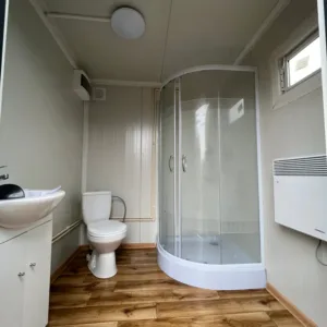 Esta unidade auto-suficiente inclui uma casa de banho completa com cabine de duche separada, lavatório com armário integrado e um esquentador instantâneo de 11 kW/380 V, garantindo água quente contínua para todo o sistema. O pavimento antiderrapante em PVC garante segurança mesmo em ambientes húmidos.