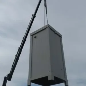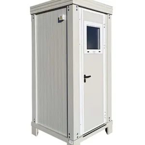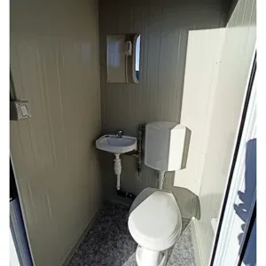 Construído em aço galvanizado e pintado (RAL 9002), possui uma sanita em cerâmica com caixa acoplada em PVC, um lavatório com torneira e um espelho, tudo alojado numa cabine sanitária robusta e bem isolada, fácil de transportar graças aos seus quatro pés de 16 cm e anéis de elevação.