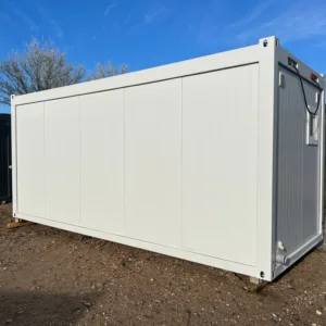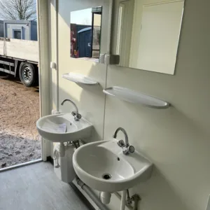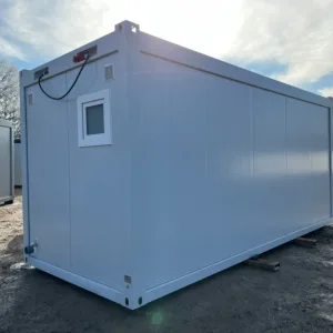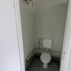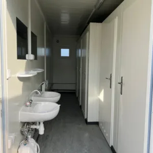 Com 5 cabines sanitárias independentes com fechadura e 2 lavatórios integrados, este contentor garante privacidade e funcionalidade aos utilizadores. Toda a estrutura é construída com materiais de alta qualidade, incluindo painéis sanduíche de 75 mm e lã mineral de 100 mm no chão e no teto, garantindo um excelente isolamento térmico e acústico.