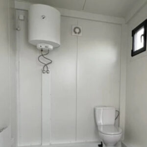 O módulo dispõe de uma casa de banho completa com chuveiro e uma sanita separada, oferecendo privacidade e funcionalidade. O sistema de descarga elétrica garante uma eliminação de águas residuais eficiente e moderna.